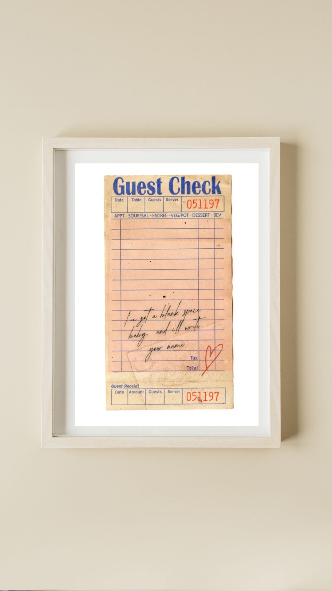 Playful, dramatic, and a little bit dangerous — this “Blank Space”-inspired guest check print brings Taylor Swift’s iconic energy to life with a retro diner twist. Set on a vintage-style guest receipt, it blends pop culture and nostalgia with a wink of sass and romance.